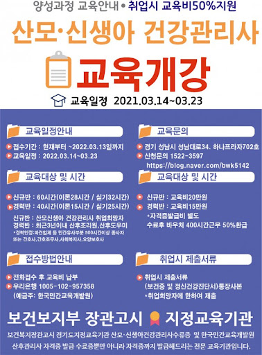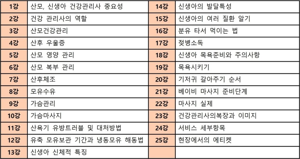 - 교육 과정: 산후관리사 자격증 교육 과정은 산후 관리와 관련된 기본적인 이론과 실습을 포함합니다. 아기 돌봄, 산모 회복 관리, 심리 상담 등의 내용이 포함된 전문 교육 과정을 수료해야 합니다. 교육 과정은 오프라인과 온라인으로 제공되며, 각 교육 기관마다 수업 시간이나 커리큘럼이 다를 수 있습니다.