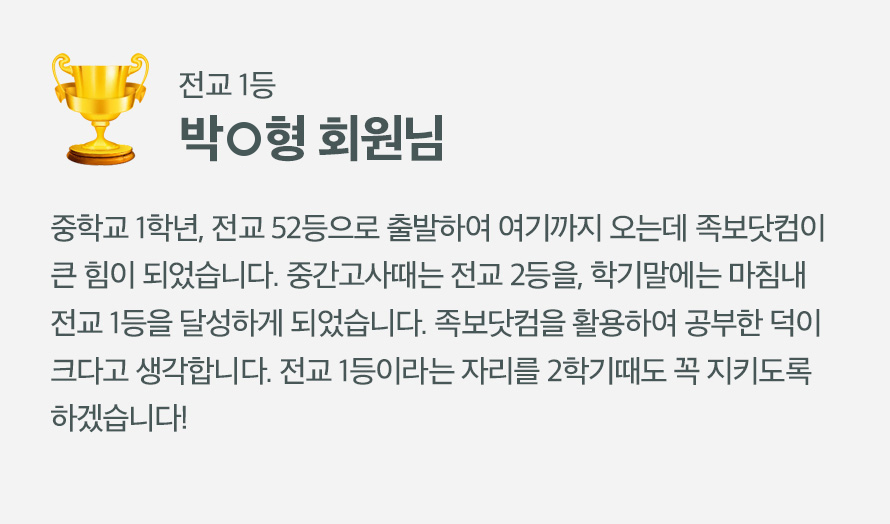 - 정기적인 평가와 점검: 족보닷컴은 정기적으로 학생의 학습 평가를 진행하여, 학습 수준을 점검하고 개선 방법을 제시합니다. 또한, 부모는 자녀의 성과를 주기적으로 확인할 수 있어, 효과적인 학습 지원이 가능합니다.
